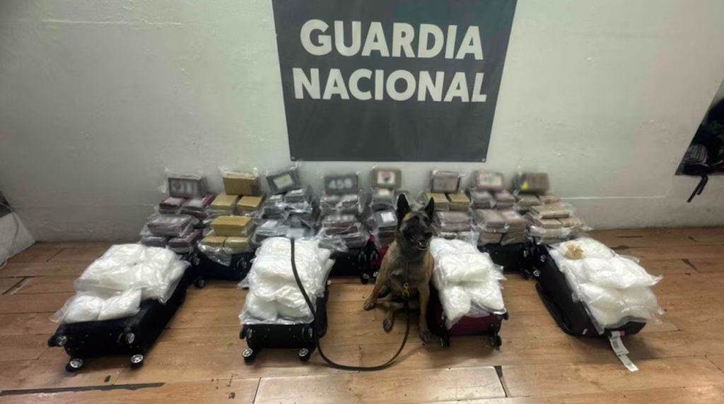 El material gráfico compartido por la Guardia Nacional muestra al ejemplar canino junto con las maletas en donde fue hallada la droga.